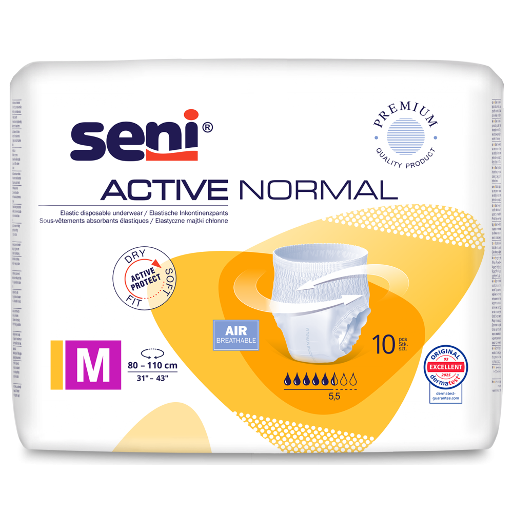 Jednorázové absorpční kalhotky Seni Active Normal jsou praktickým a diskrétním řešením pro aktivní lidi, kteří si cení pohodlí a jistoty. Seni Active Normal jsou určeny pro střední stupeň inkontinence. Jsou elastické a vypadají i nosí se jako běžné spodní prádlo. Jsou ideální volbou i pro osoby, které odmítají nosit klasické pleny, například při Alzheimerově chorobě nebo jiných formách demence. Kalhotky jsou vybaveny postranními hydrofobními volánky a systémem Extra Dry System (EDS) pro účinnou ochranu proti únikům.